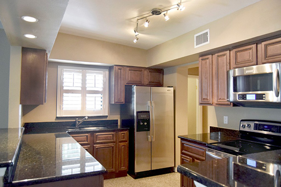 cherry wood cabinets, stainless steel appliances, washer and dryer and plantation shutters. Open floor plan with terrazzo floors throughout and a wood